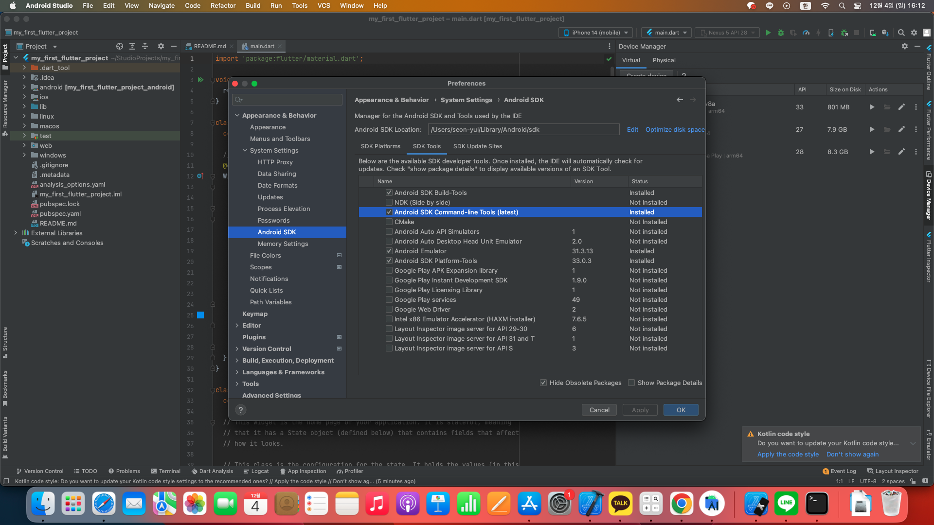상단 바에 안드로이드 스튜디오 - preference - appearance & Behavior - System Settings - Android SDK - SDK tool 탭 - Android SDK Command-line Tool 이 체크가 안되어있을것이다