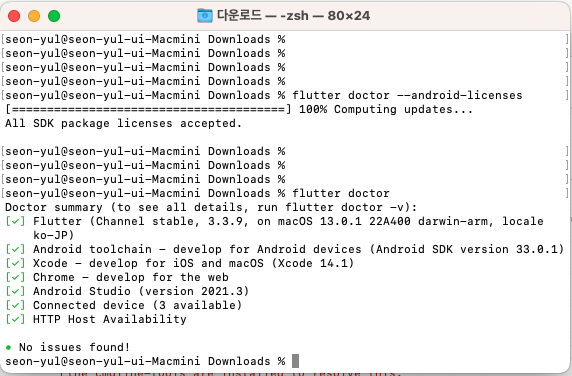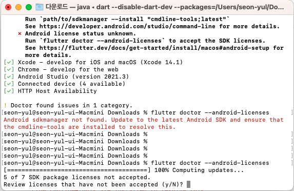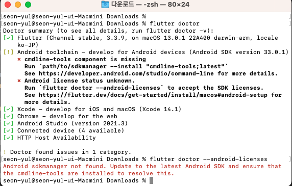 flutter doctor에서 다음과같이 에러가 나왔다.